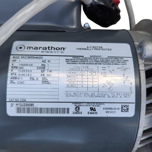 - Marathon Electric 5KC39RN44GX, 1 HP, 3450 RPM, 1-phase, 115/208-230 V, Frame 56C, Code J (per nameplate details).