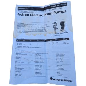 Action Electric Drum Pump ACT-HDESS with upgraded Marathon 5KC39RN44GX 1 HP 115/208-230V 3450 RPM motor, 316 SS wet end, Teflon/Viton seal, 3/4″ FPT outlet, EPDM 1″-ID hose; max head 10.0 ft (water); viscosity guidance up to 2000 cPS for non-flammable compatible liquids