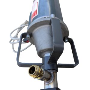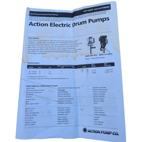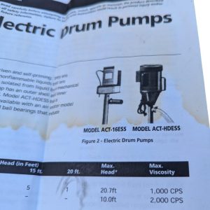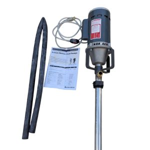 Action Electric Drum Pump ACT-HDESS with upgraded Marathon 5KC39RN44GX 1 HP 115/208-230V 3450 RPM motor, 316 SS wet end, Teflon/Viton seal, 3/4″ FPT outlet, EPDM 1″-ID hose; max head 10.0 ft (water); viscosity guidance up to 2000 cPS