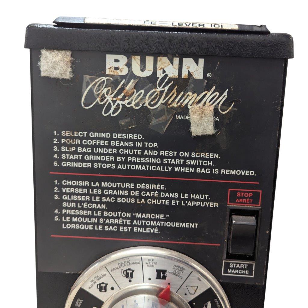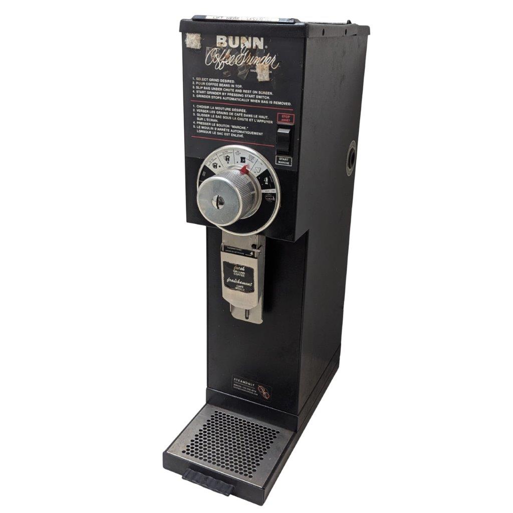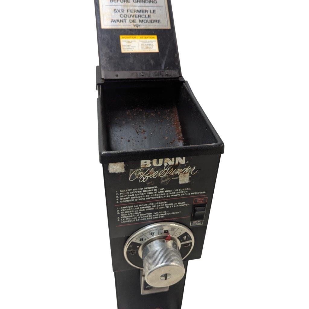 bunn g3 hd bulk coffee grinder; 3 lb retail grinder 120v; model 22100.6000; commercial burr grinder with bag clamp; grocery store coffee grinder; device to grind coffee beans; spice grinder commercial; motor reset coffee grinder; lr57164 wmsc listed; used bunn grinder needs cleaning