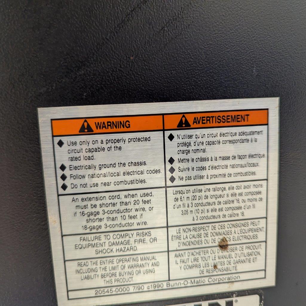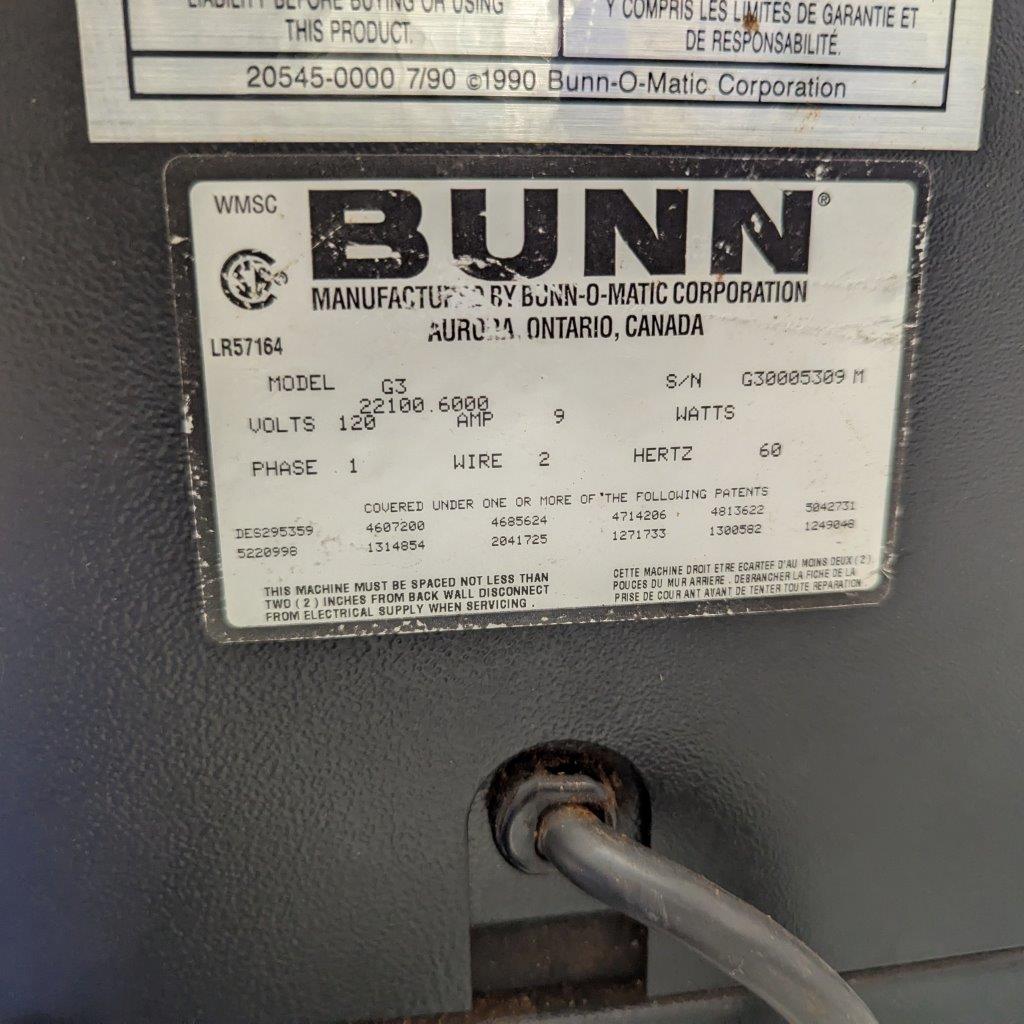 Plate markings on this unit: Model G3 · Cat. 22100.6000 · 120 V, 9 A, 1 PH, 60 Hz, 2-wire · BUNN · WMSC · LR57164 · Patents DES295359, 4,607,200, 4,685,624, 4,714,206, 4,813,622, etc.