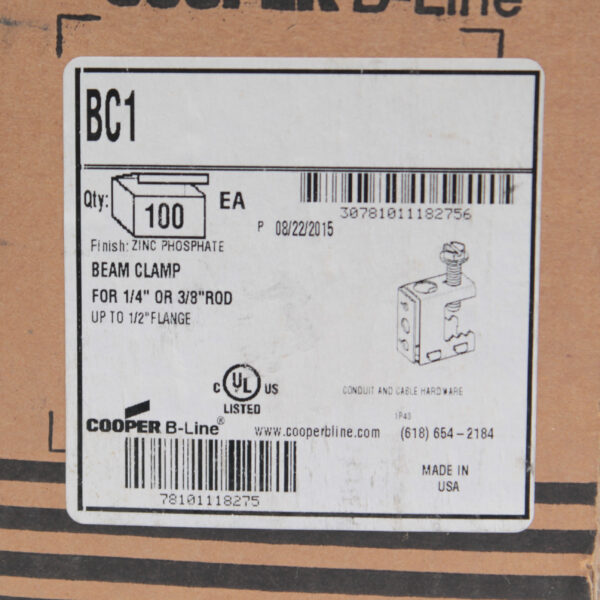 The Cooper B-Line BC1 is a high-strength conduit to beam fastener designed for securely attaching conduit to beams and flanges up to 1/2 inch thick. Made from spring steel, the BC1 fastener provides strong holding power while maintaining flexibility to allow for secure yet easy installation. It is UL-listed for use in both the U.S. and Canada, meeting rigorous safety and performance standards. With a 100-pound load capacity, it is suitable for supporting conduit in a wide range of industrial and commercial electrical installations. This model comes in a standard package of 100 pieces for bulk use in large-scale projects.