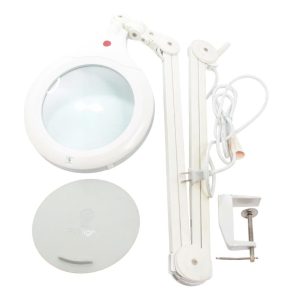 - “Clamp-on magnifier lamp for fine inspection and detailed assembly”