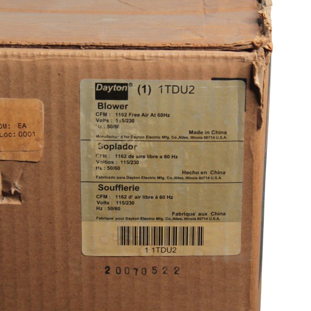 Dayton 1TDU2 is a direct-drive centrifugal (squirrel-cage) blower assembly using a PSC (Permanent Split Capacitor) motor and a forward-curved wheel. It’s built for dependable airflow in HVAC equipment, appliance convection, cabinet ventilation, and general-purpose air movement where a compact, integrated blower housing is preferred over belt-driven systems. The label confirms dual-voltage (115/230V) operation and free-air airflow rating of 1162 CFM @ 60 Hz, making it a strong choice for replacement and retrofit work where performance and mounting geometry must match.