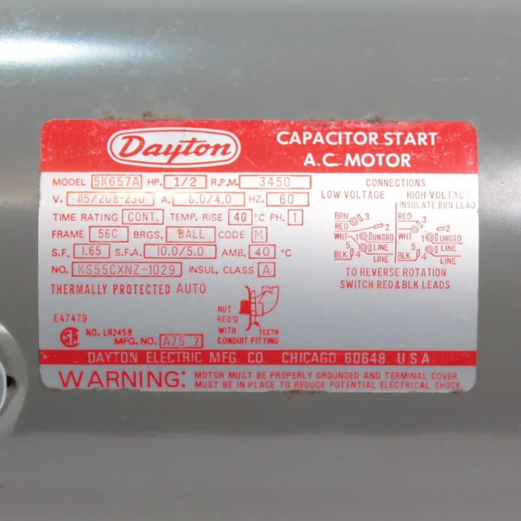 dayton 5k657a general purpose motor; device to drive pumps, fans, small machinery; 1/2 hp 3450 rpm single-phase motor; 56c c-face footed motor; open dripproof ball-bearing motor; reversible hvac/r drive motor; dual voltage 115/208-230v ac motor; high service factor 1.65 motor; ks55cxnz-1029 equivalent; nbk parts 56c 1/2 hp motor