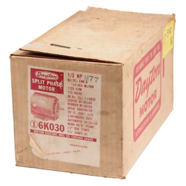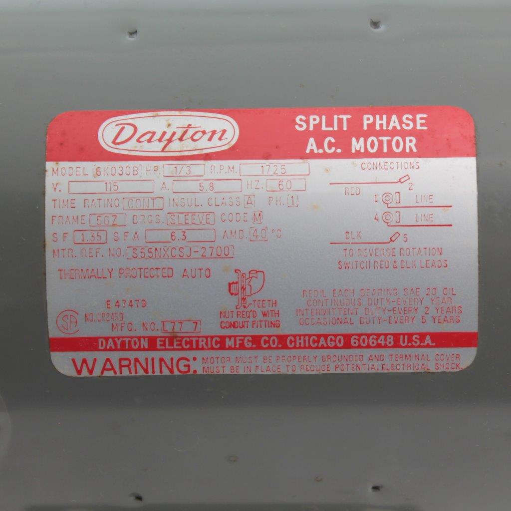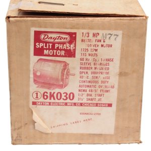 The DAYTON 6K030 is a belt-drive fan/blower motor built for HVAC/R duty where reliable, continuous operation and easy service matter. Its split-phase design provides smooth start-ups, while a robust 56Z rolled-steel frame with open-dripproof (ODP) cooling keeps the motor compact and well-ventilated in equipment rooms. With 1/3 HP, 1725 nameplate RPM, 115 VAC, ball bearings, and a stout 1.35 service factor, this motor is an excellent choice for belt-driven blowers and fans. The reversible rotation (wired for CCWSE/CWLE) and cradle base simplify field replacements, and the included 1/2″→5/8″ bushing helps match common pulley/bore combinations.