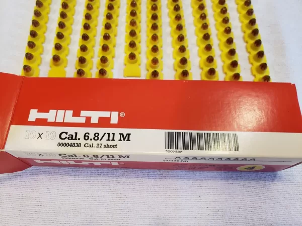 Hilti 100 pack Cal. 6.8/11M 3/130 #00004838 Cal. 27 Short #4 – Made in USA – UN-No 0323 – 4847/0 – Yellow – Clas 1.4S Safety cartridges – DX 36M, DX 350, DX450, DX A