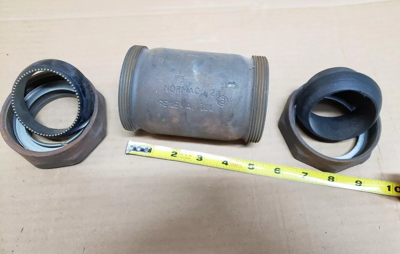 This is a Normac BT compression end coupling sized for 2″ IPS steel pipe. BT-series couplings are the rugged, threadless way to join or repair steel lines in tight spaces—no threading dies, welding, or hot work needed. Each end uses a compression nut and sealing/follower set to grip the pipe OD and make a pressure-tight joint. Normac (Geneva, Illinois) couplings were widely used by mechanical, municipal, industrial, and HVAC contractors for quick permanent repairs on black iron, galvanized, and process lines.