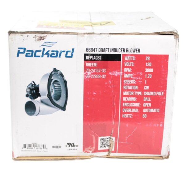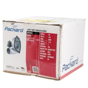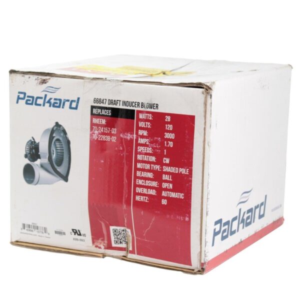 The Packard 66847 is a direct-replacement draft inducer blower motor engineered for Rheem/Ruud and other OEM inducer assemblies calling for a 120 VAC, shaded-pole, C-frame motor. Rated 28 watts, 3000 RPM, 1/30 HP, with ball bearings and automatic overload protection, this service motor restores proper pre-purge/combustion air flow for furnaces and boilers using compatible housings/wheels. Its open (OAO) enclosure cools in the inducer’s airflow path, and the supplied gasket helps ensure a tight seal during reassembly.