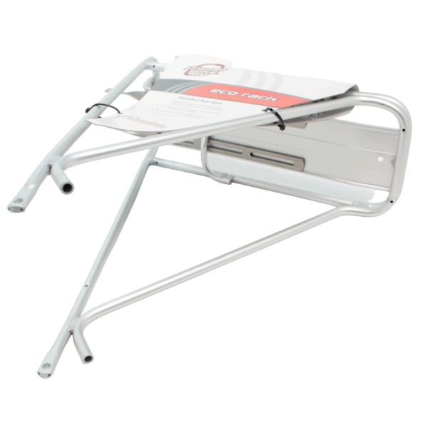 The Planet Bike Eco Rack (Part #4002) is a durable, lightweight, and cost-effective rear cargo rack designed to turn almost any standard bicycle into a practical cargo-hauling machine. Built from sturdy tubular 6061 aluminum and finished in silver, this rack combines classic utility with easy installation and wide compatibility. It’s ideal for commuting, touring, or running errands, offering a standard platform and side rails for panniers, trunk bags, and baskets. With its universal mounting system, it fits bikes with 26″, 27.5″, 700c, and 29″ wheels, including many hybrid, road, and mountain bikes with appropriate eyelets.