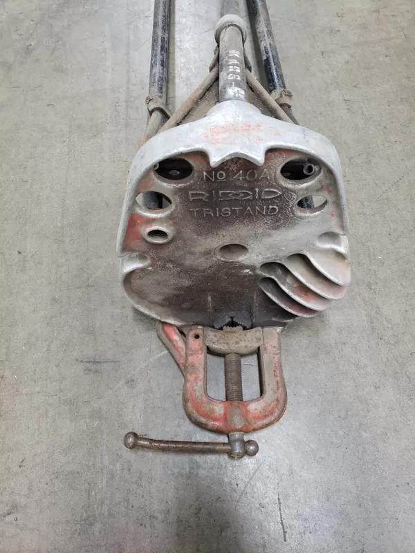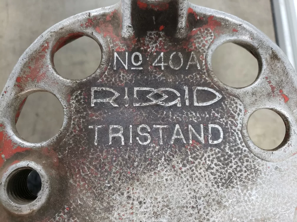 RIDGID(R) tristand yoke vise, model 40-A. Legs fold for carrying, vise base overhangs front legs so threaded handles swing clear. Efficient yoke vise, alloy steel jaws, hardened for firm grip and long wear.