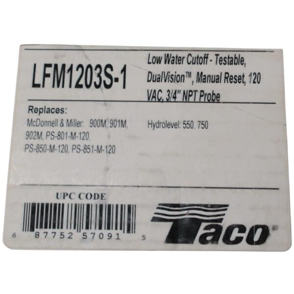 The Taco LFM1203S-1 Low Water Cutoff provides reliable protection for hydronic heating systems, ensuring boilers operate safely. This manual-reset LWCO halts boiler operation if water levels drop below safe thresholds, safeguarding against damage and hazards. It is equipped with advanced signal processing technology and DualVision to enhance accuracy and mitigate issues such as particulate buildup and foam interference.