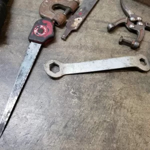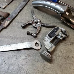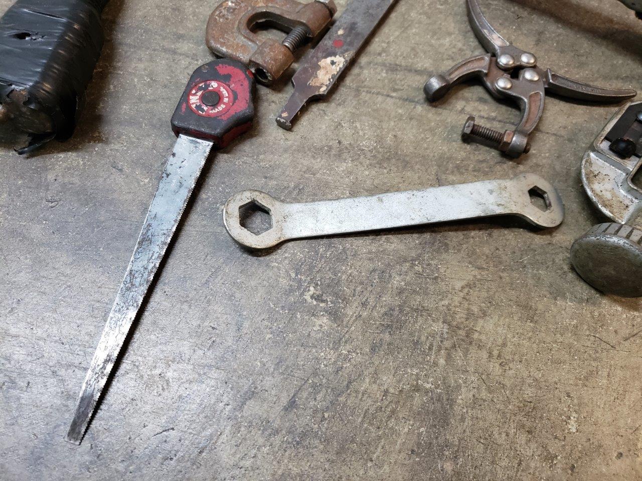 pipe cutter, file, screwdriver, C-Clamp, pliers, cutters, hand plane